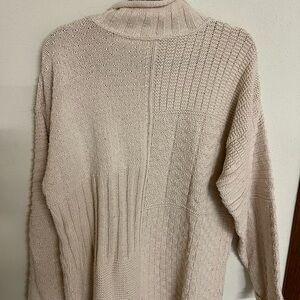 Chunky knit sweater with mixed stitch patchwork. Soft cream color and cozy turtleneck. Relaxed fit for easy layering. Versatile neutral for casual outfits.