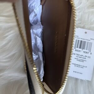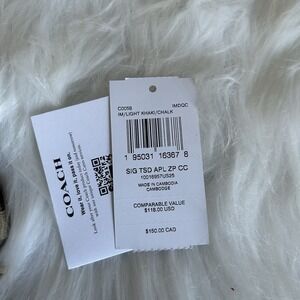 Coach Signature Zip Card Case in Light Khaki and Chalk combines iconic style with everyday functionality. Crafted from signature coated canvas and smooth leather, this compact accessory features a secure zip-top compartment for coins or folded bills, multiple external card slots, and a clear ID window on the reverse. The elegant gold-tone chain wristlet strap allows for versatile carrying, while the classic logo hardware adds a polished finish to this essential organizer.