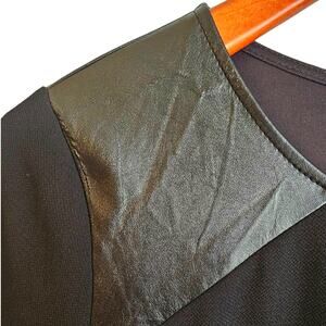 Everly Black Whimsygoth Shift Dress with Faux Leather Shoulder Panels. Features rounded neck with faux leather upper shoulder accent panels, 3/4 sleeve, pleat on the back, and above knee length.