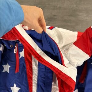 Tipsy Elves American Flag ski suit makes a bold statement on the slopes with its vibrant red, white, and blue stars and stripes design. This insulated one-piece features a full-zip front with a snap-button storm flap, a high stand collar, and an adjustable belted waist for a secure fit. Functional details include multiple zippered pockets, elasticized cuffs, and a large "USA" embroidery on the back. Perfect for winter sports, themed parties, or patriotic celebrations.