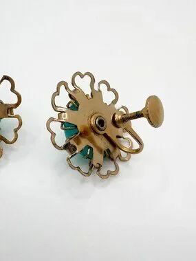 Vintage 1950s Turquoise Moonglow Lucite Earrings Gold Tone Floral Screw Back