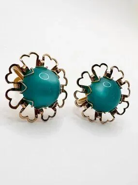Stunning vintage 1950s moonglow lucite earrings in a dreamy turquoise shade.These feature glowing domed lucite centers surrounded by a delicate gold-tone floral setting—such a perfect mid-century look!