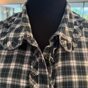 The size tag has been removed but this shirt is a Large. Clean and smokefree and in excellent condition. Full button down with ruffles down the front, on collar and on cuffs. Color is hunter green and white plaid. Measures 30” long and sleeves are 25”. Armpit to armpit is 23” while laying flat.