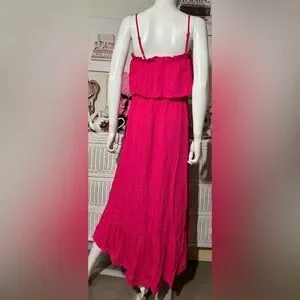 Lulus Maxi Dress High Low Smocked Low Cut Ruffles Layered in Hot Pink Size M NWT