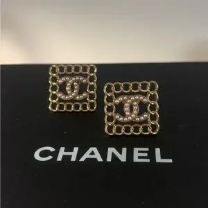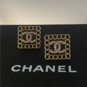 Authentic Chanel Vintage Gold-Pearl Buttons Repurposed CC Logo Chain Earrings