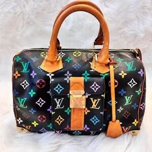 Louis Vuitton Black Multicolor Monogram Speedy Satchel with Tan Leather