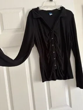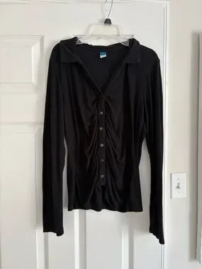 Old Navy long sleeve top with a ruched button-front design. Lightweight, soft knit fabric for easy layering. Pointed collar and fitted silhouette. Simple, versatile piece for casual or dressier looks.