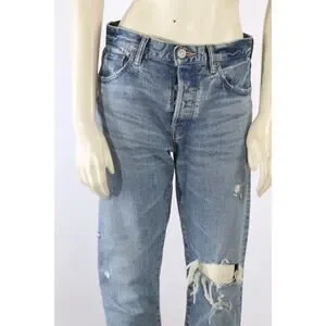 Elevate your denim collection with these authentic MOUSSY VINTAGE distressed jeans. Expertly crafted in Japan, these jeans feature the brand's signature high-quality denim and unique, hand-finished distressing for a truly lived-in look. The straight-leg silhouette and high-rise waist offer a timeless, flattering fit that bridges the gap between vintage charm and modern style.