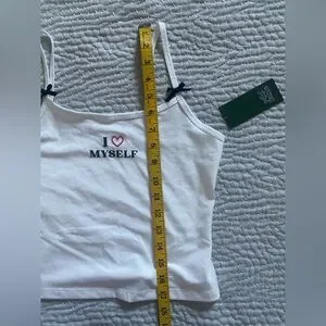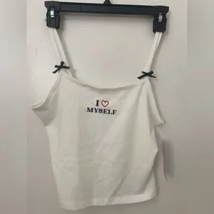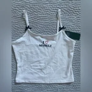Trendy cropped top featuring a bold “I Love Myself” graphic across the chest. Perfect for casual outfits, lounging, or pairing with high-waisted jeans or skirts. Soft, comfortable fabric with a flattering cropped fit.