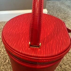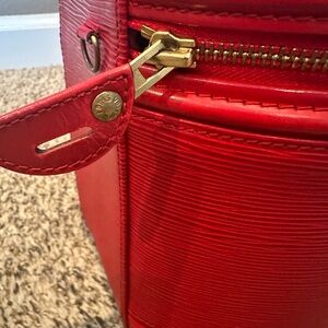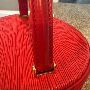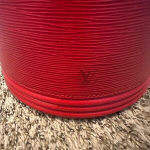 Structured cylindrical silhouette in textured Epi leather. Single top handle for carried wear. Gold-tone zipper closure and hardware accents. Subtle embossed LV logo at front. Bold red hue for statement styling.