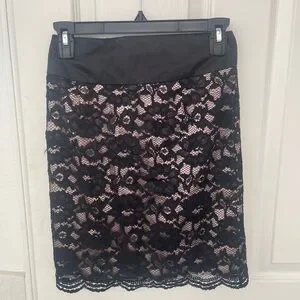 Figure-hugging pencil skirt with delicate black floral lace overlay. Soft nude lining provides subtle contrast. Sleek waistband for a polished look. Versatile for dressy evenings or office outfits.
