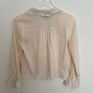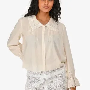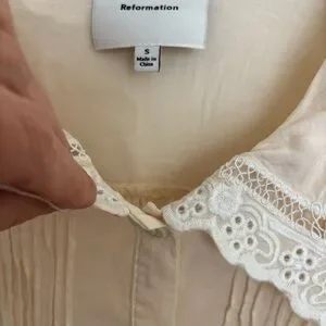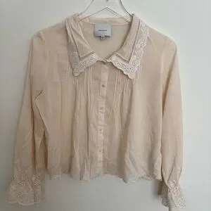 Reformation cream blouse with embroidered lace collar. Pintuck detailing down the front. Long sleeves with eyelet and flared cuffs. Lightweight, flowy fabric for a feminine look.