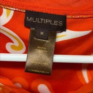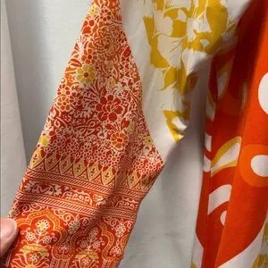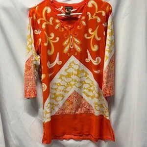EUC-Bold orange tunic with white and yellow patterned accents. V-neckline with three-quarter sleeves. Lightweight drape and relaxed silhouette. Stylish geometric and floral-inspired print.