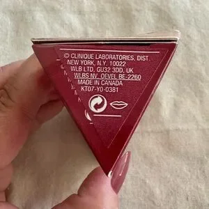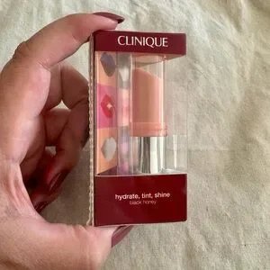 Clinique moisturizing lip balm in a soft peach shade. Provides subtle tint and shine. Smooth, lightweight formula. Easy for everyday wear.