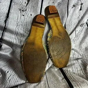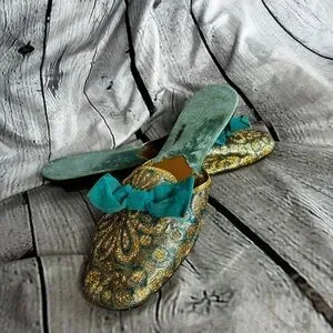 Vintage Ornate Brocade Bow Low Heel House Jacquard Slippers Gold Teal AS IS 10.5