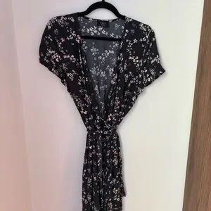 Flowy Vici dress with a feminine floral pattern. V-neck silhouette with a tie waist (ties from inside & outside). Short sleeves and gentle drape. Easy, elegant look for many occasions.