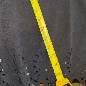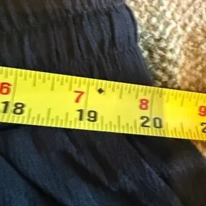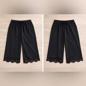20” waist (w/o stretch) 14” rise and 21.5” inseam. Easy pull-on cropped pants with an elastic drawstring waist. Wide-leg silhouette for relaxed wear. Delicate laser-cut scalloped hem detail. Side pockets add everyday convenience. Smooth, lightweight fabric for versatile styling. Smoke and pet free home. Sold as is.