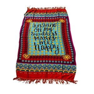 Lightweight cotton sarong featuring a vibrant boho floral print and the cheerful phrase "Sunshine on my shoulders makes me happy" in a scripted font. This versatile piece is designed with a colorful border and finished with a knotted fringe trim along the ends. Perfect for use as a beach cover-up, wrap, or decorative textile, it offers a soft, breathable feel and a bold, summery aesthetic.