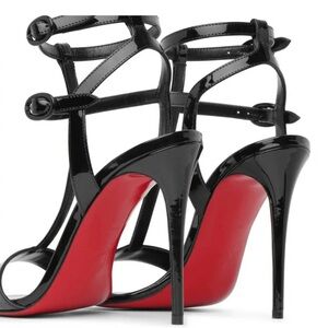 Sleek patent leather strappy T-bar sandals by Christian Louboutin. Open toe with double ankle straps for a chic fit. High-gloss finish offers a polished evening look. Signature refined silhouette for classic elegance.