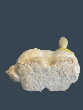 Charming vintage Easter bunny featuring a soft flocked fabric finish and a bright yellow ribbon with white polka dots. This sweet rabbit has a classic mid-century look and displays nicely despite age-related wear, making it a great addition to a vintage spring or Easter collection.