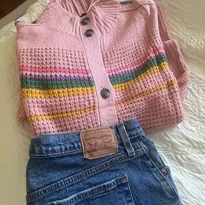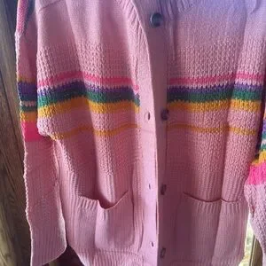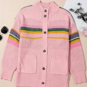 Super Soft pink cable knit cardigan Decorative stripes in yellow, green, purple and pink add playful contrast. Lightweight layer for casual outfits.