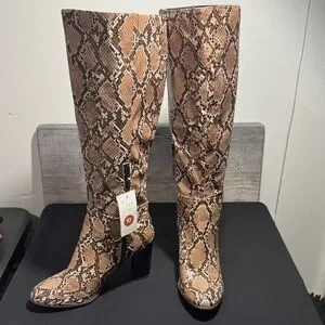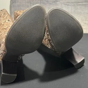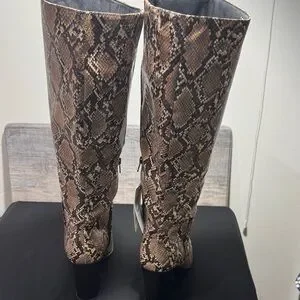 Tall over-the-knee boots with all-over snake print. Stacked block heel for stable wear. Side zip for easy on and off. Statement pattern that pairs with dresses or denim.