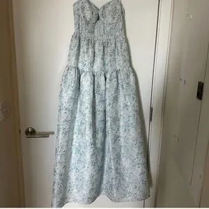 Light blue floral with delicate sweetheart neckline and thin shoulder straps. Soft, flowing silhouette for effortless summer style. Floral print adds a romantic, feminine touch.