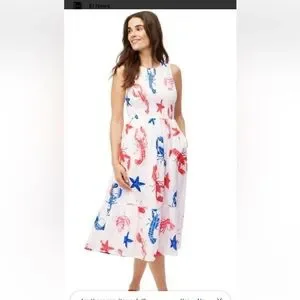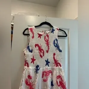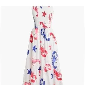 Smocked bodice with round neckline. Sleeveless design. Bold red and blue lobster motifs on white fabric. Casual summer style with playful print.