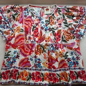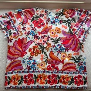 Lightweight babydoll silhouette with gentle gathers. Short ruffle sleeves and embroidered yoke detail. Bright floral print in pinks, oranges and green leaves & bananas . Playful and feminine for warm-weather outfits. With Pom Pom details on sleeves.