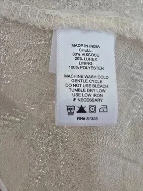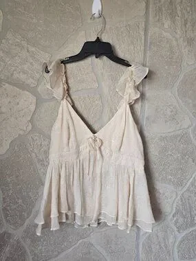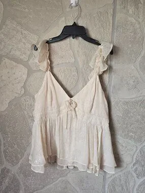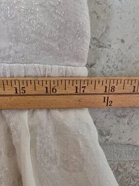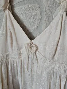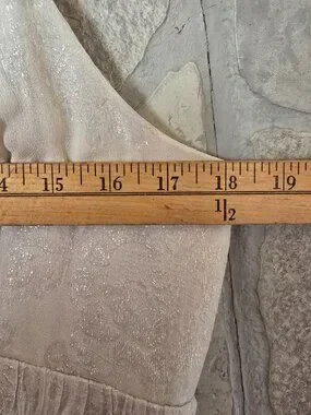 Features a flattering babydoll silhouette, deep V-neckline, and lightweight flowy fabric with subtle shimmer. New without tags, never worn. Size Large. Comes from a smoke-free, pet-free home.