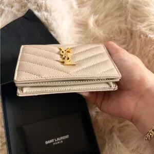 Saint Laurent Beige Chevron Quilted Card Holder with Gold YSL