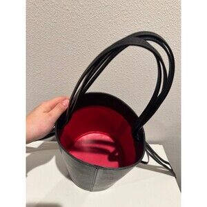 Italian vegetable tanned leather black fringe bucket bag with red matte patent interior.