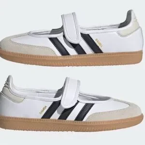 Classic Adidas Samba styling in a Mary Jane silhouette. White leather upper with black three-stripe accents. Hook-and-loop strap for easy wear. Gum rubber sole for traction and sporty style.