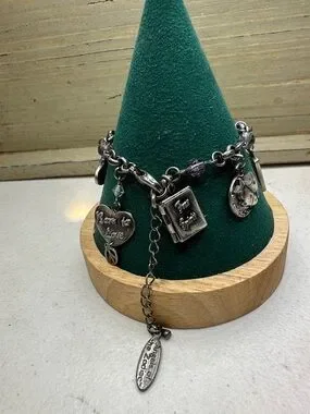 This bracelet features charms such as water lillies, hearts, Pisces signs, a book etc.