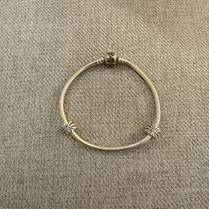 Polished 925 inscribed silver snake chain bracelet by Pandora. Two starburst-style spacer charms with 925 inscribed add subtle detail. Secure Pandora-branded barrel clasp. Elegant and versatile for daily wear or stacking. See pictures for accurate depiction of condition and size.