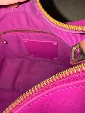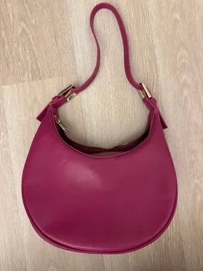 Stylish crescent shoulder bag in vibrant raspberry pink. Smooth leather finish with gold-tone hardware. Secure zip top and comfortable single strap for everyday wear. A polished, versatile accessory to elevate any outfit.