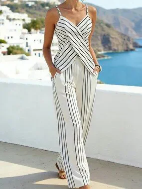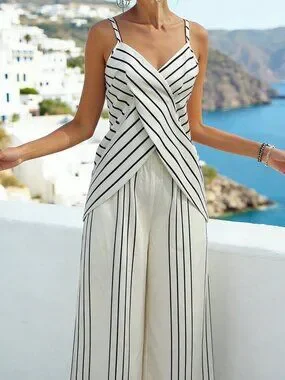 White Striped Women's V-Neck Camisole Wide-Leg Jumpsuit