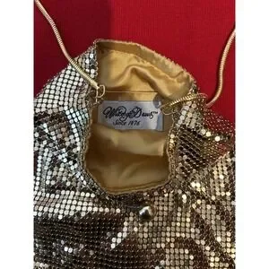The Vintage Whiting & Davis Gold Mesh Crossbody Bag is a stylish and luxurious accessory from the 1980s, perfect for disco-themed evening events. This purse features a chic gold mesh material with fringe detailing, exuding a glamorous and retro vibe. Made in China for women who appreciate vintage fashion, this crossbody bag embodies the disco era's sparkle and sophistication.