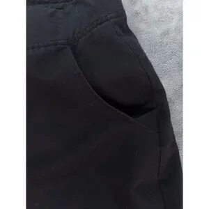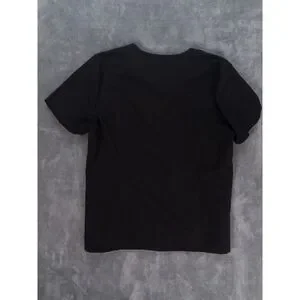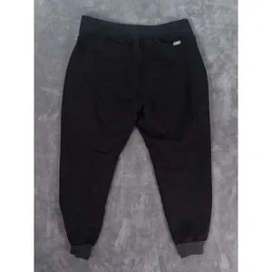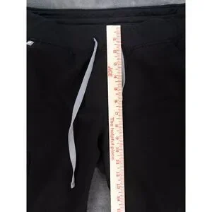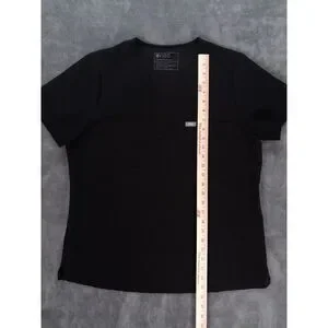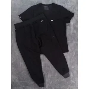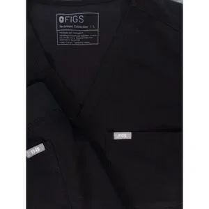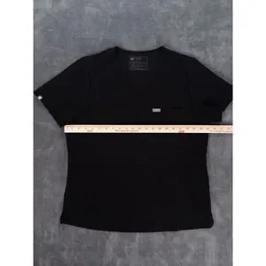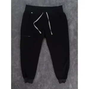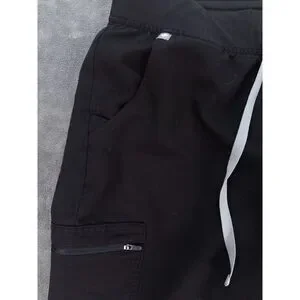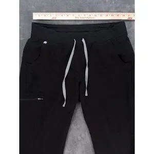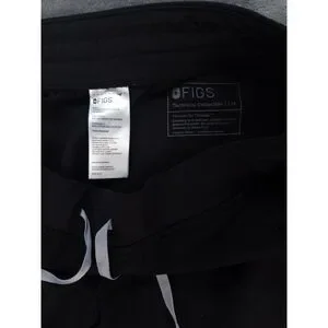 Pre-owned FIGS scrub set in classic black, includes Zamora jogger pants (Women’s Large Petite) and Catarina scrub top (Women’s Large). no major flaws noted. Pants feature elastic waist with drawstring, multiple pockets including zip pocket. Top has V-neck with chest pocket. Comfortable, stretchy performance fabric ideal for healthcare professionals. See photos for measurements and details.