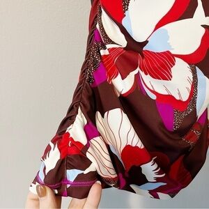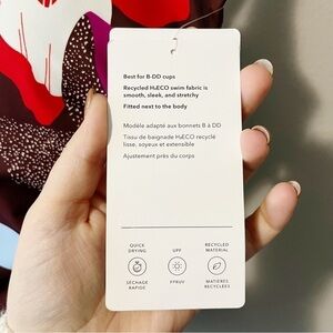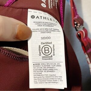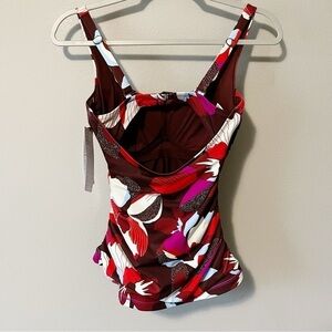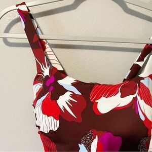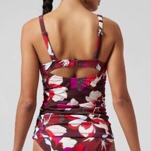 Brand new with tags Athleta Square Neck Bra Cup Tankini Swim Top in a tropical floral print in red/purple/pink/blue/white. Size 32D/DD. Quick drying. UPF sun protection. Side ruching. Adjustable straps and back bra closure. Retailed for $79. NWT.