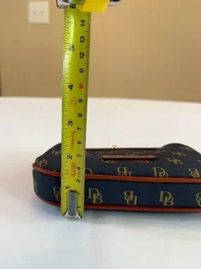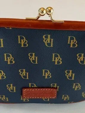 DOONEY & BOURKE Gretta framed navy blue coin purse with kisslock. Water-repellent navy blue coated fabric with signature monogram pattern "DB" in Gold. Interior in excellent condition. Card slots on each interior side. Smoke free home. Offers welcome. Approximate measurements: