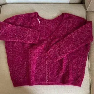 Reposhing this item I purchased as it is sadly too short on my torso. I am so sad to let it go because it is TRULY beautiful! Approximately 22" length, 27" pit to pit. Wool/Kid Mohair. Can be worn as a V-neck cardigan or a v-neck sweater with back opening.
