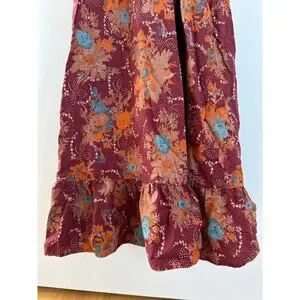 Step into vintage charm with this stunning Lanz Originals maxi dress! Featuring a deep burgundy base with vibrant floral print in orange, blue, and tan hues. Smocked bodice with ruffled bust detail and adjustable straps. Flowing skirt with tiered hem and romantic cottagecore vibes — perfect for summer festivals, fall layering, or prairie-inspired styling.