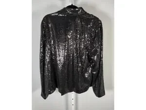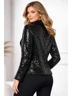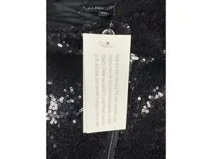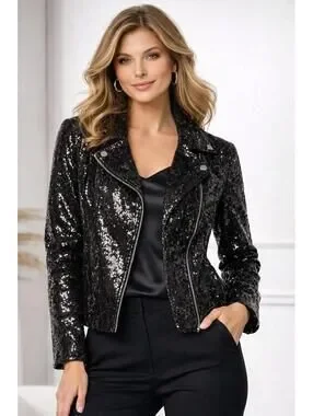 New with tags, this stunning Colleen Lopez black sequin moto jacket is perfect for adding a touch of glam to any evening outfit. Featuring a classic biker blazer silhouette with an asymmetrical zip closure and sparkling sequin embellishments throughout, this jacket offers a sleek, fitted look that enhances your silhouette. Ideal for special occasions, parties, or a chic night out, it combines edgy style with elegant sparkle.