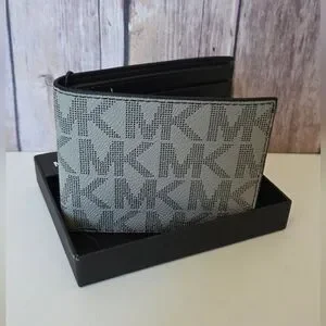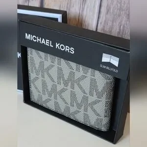 Michael Kors slim billfold wallet with signature MK logo print. Gray and light gray tones. Sleek and compact. Great everyday style. NIB. Retail $98.00 View pics please
