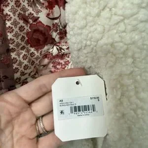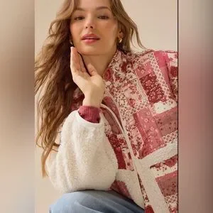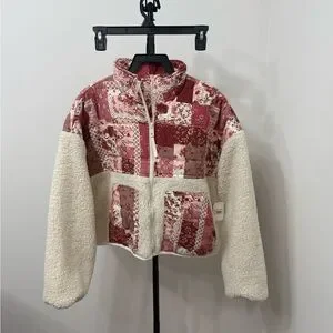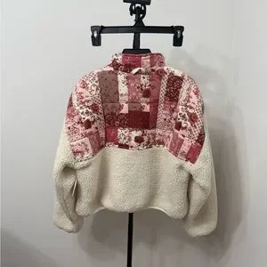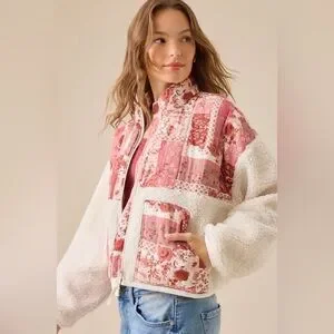 Cozy sherpa jacket with pink floral patchwork panels. Front zip closure and stand collar. Soft cream sherpa on sleeves and body. Relaxed, boxy fit. Eye-catching mixed-fabric design.