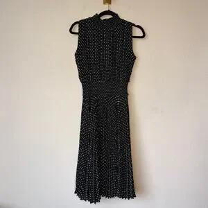 Nanette Lepore chic sleeveless midi dress. Allover white polka-dot print on black with a mock-neck collar, smocked waist, and a soft pleated skirt. Lightweight woven fabric with full lining. Feminine, timeless, and perfect for work, events, or special occasions. Size 2 - 17.5" pit to pit; 11.5" waist; 33" from pit.