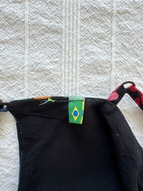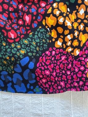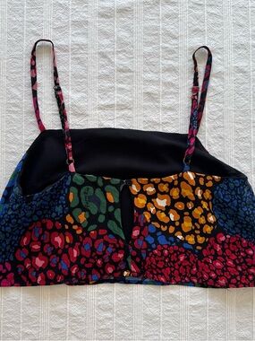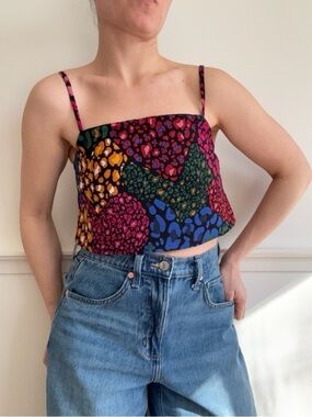 Crop cami with a square neckline and adjustable spaghetti straps. Lightweight woven fabric with a bold multicolor spotted floral print. Designed for a cropped, relaxed fit that pairs easily with high-waist jeans or skirts. Features vibrant pink, blue, green, yellow and red tones for a lively look.