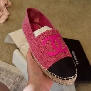 Chanel espadrilles in hot pink bouclé fabric. Black capped toe for contrast. Size 40 but feet like size 9 in my opinion because I have a wider feet.