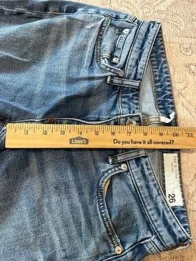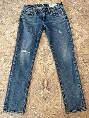 Slim-fit women's jeans from rag & bone. Medium blue wash with light fading and subtle distressing. Classic five-pocket styling and tapered leg. Versatile denim for everyday outfits.